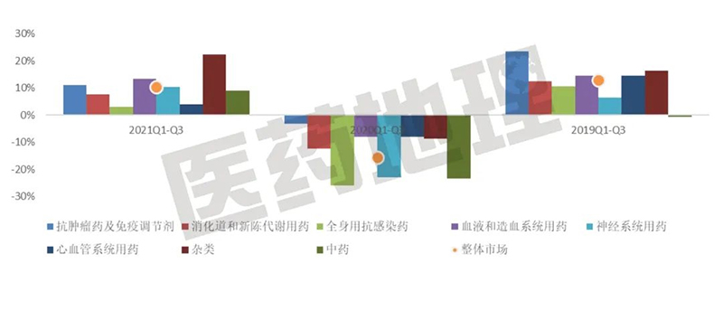 基于PDB國內(nèi)樣本醫(yī)院市場數(shù)據(jù),2021年前三季度,統(tǒng)計TOP8治療領(lǐng)域增長情況后發(fā)現(xiàn)(以ATC一級分類計),相較于2020年同期都是正增長,但消化道和新陳代謝用藥、全身用抗感染藥、心血管系統(tǒng)用藥、中藥的增幅都在當期整體市場均值以下;而抗腫瘤及免疫調(diào)節(jié)劑、血液和造血系統(tǒng)用藥和雜類這3個領(lǐng)域在近三年前三季度的同比增幅都高于市場均值,顯示出一定的成長能力。