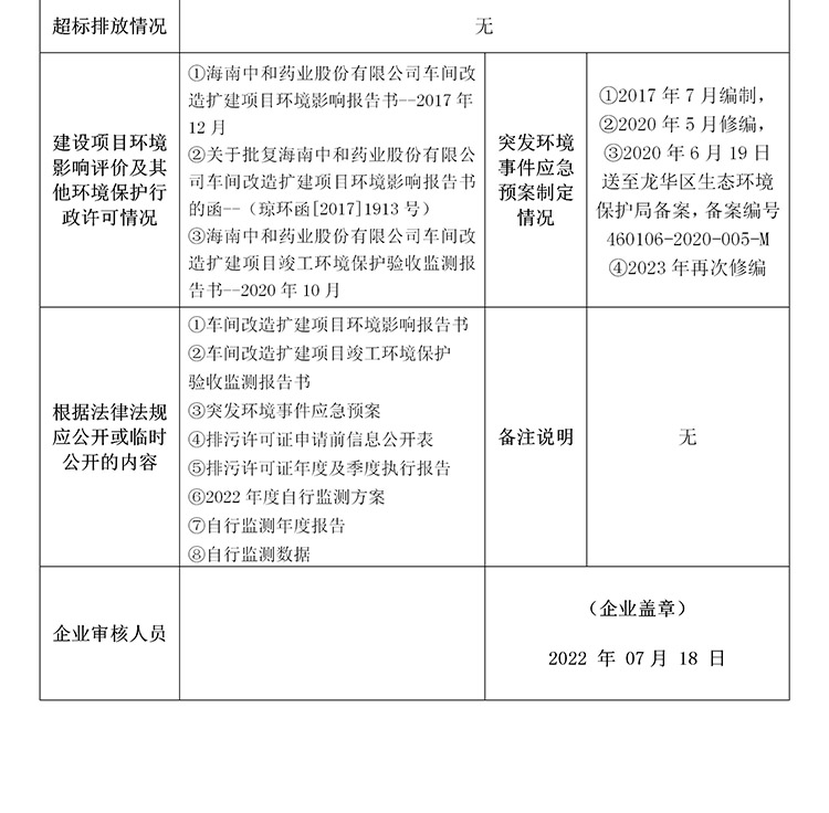 海南中和藥業(yè)股份有限公司2022年??谑兄攸c(diǎn)排污單位環(huán)境信息公開表