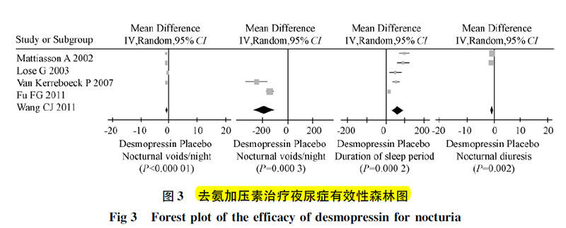 5 個用于Meta 分析的RCT包含619 例患者( 去氨加壓素治療組317 例,對照組302 例) 。采用卡方檢驗對各項獨立研究的效應(yīng)值進(jìn)行異質(zhì)性檢驗( 檢驗標(biāo)準(zhǔn)為P < 0. 1) ,異質(zhì)性是存在的,因而采用隨機(jī)效應(yīng)模型。結(jié)果顯示,去氨加壓素能夠有效減少或減輕夜尿次數(shù)、夜尿量、夜間多尿情況( 分別為P < 0. 00001、P = 0. 000 3、P = 0. 002) ,并且去氨加壓素組患者入睡至第1 次起床排尿的時間也明顯延長( P = 0. 00002) 。