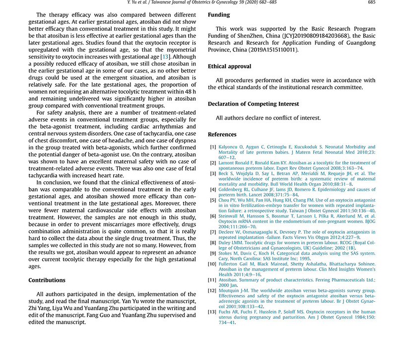 結(jié)論:我們的研究結(jié)果支持阿托西班對(duì)比目前常規(guī)治療是更為先進(jìn)的宮縮抑制劑,尤其是對(duì)于高孕齡者。